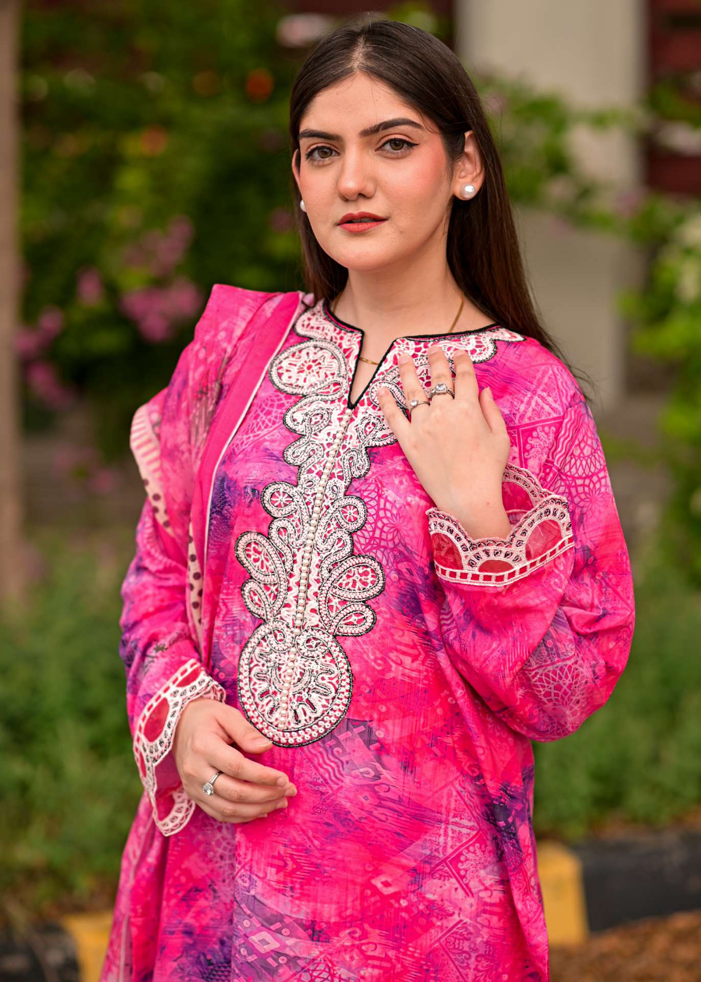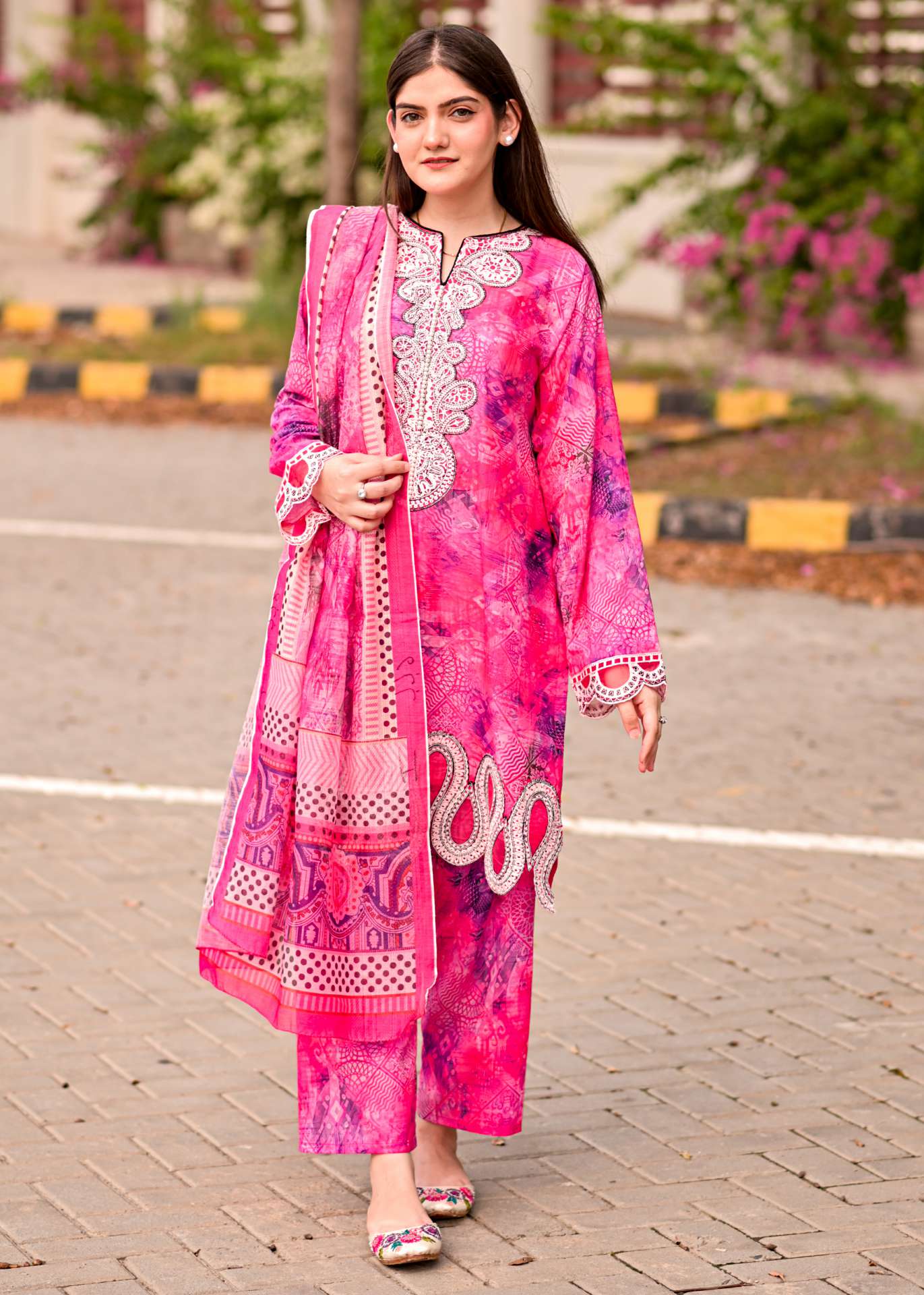 Our fabric is crafted from 100% pure cotton lawn, celebrated for its lightweight, breathable, and luxuriously soft nature. With its fine, smooth texture and graceful drape, this fabric offers effortless elegance while ensuring all-day comfort. Designed to keep you cool and fresh in warm weather, it blends timeless sophistication with natural ease, making it a perfect choice for both everyday wear and special occasions.
