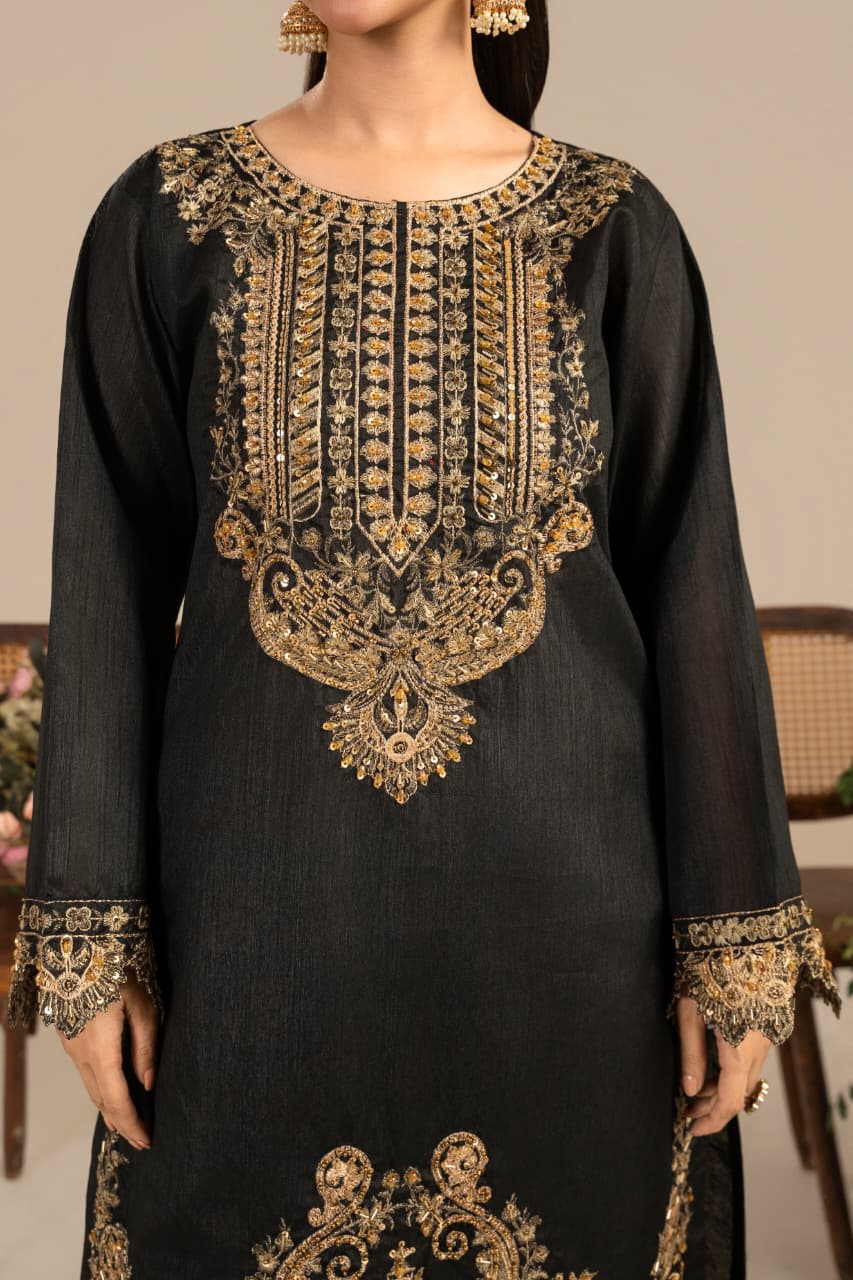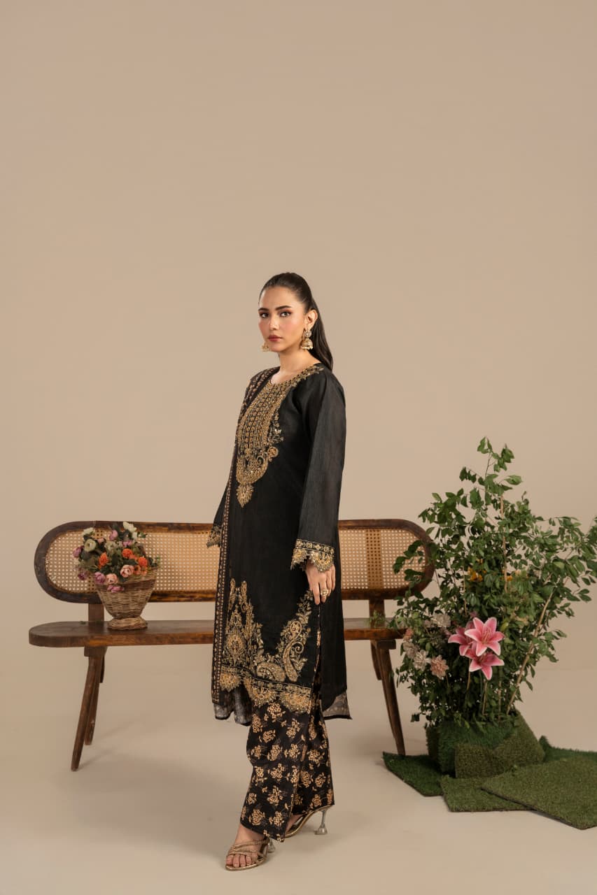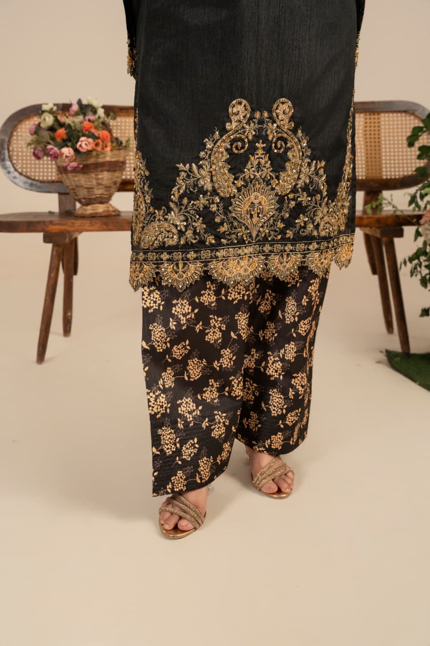 Step into timeless sophistication with Midnight Bloom, a masterpiece crafted from luxurious Raw silk, designed to embrace the warmth of winter with regal charm. The deep black canvas blooms with exquisite gold embroidery, gracefully tracing the neckline, sleeves, and hem in intricate patterns that exude grandeur.