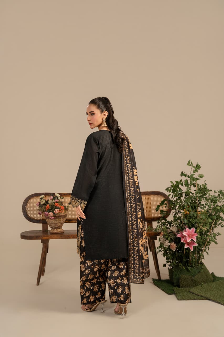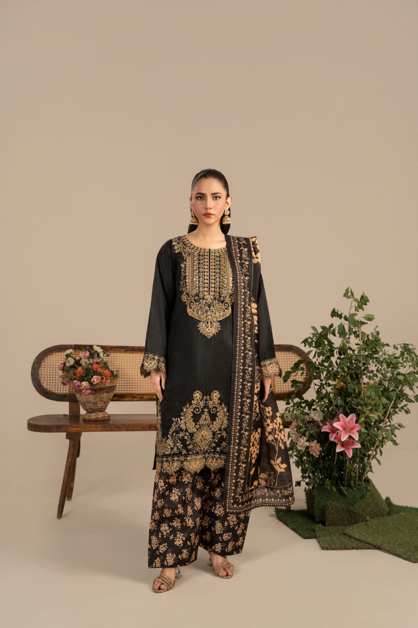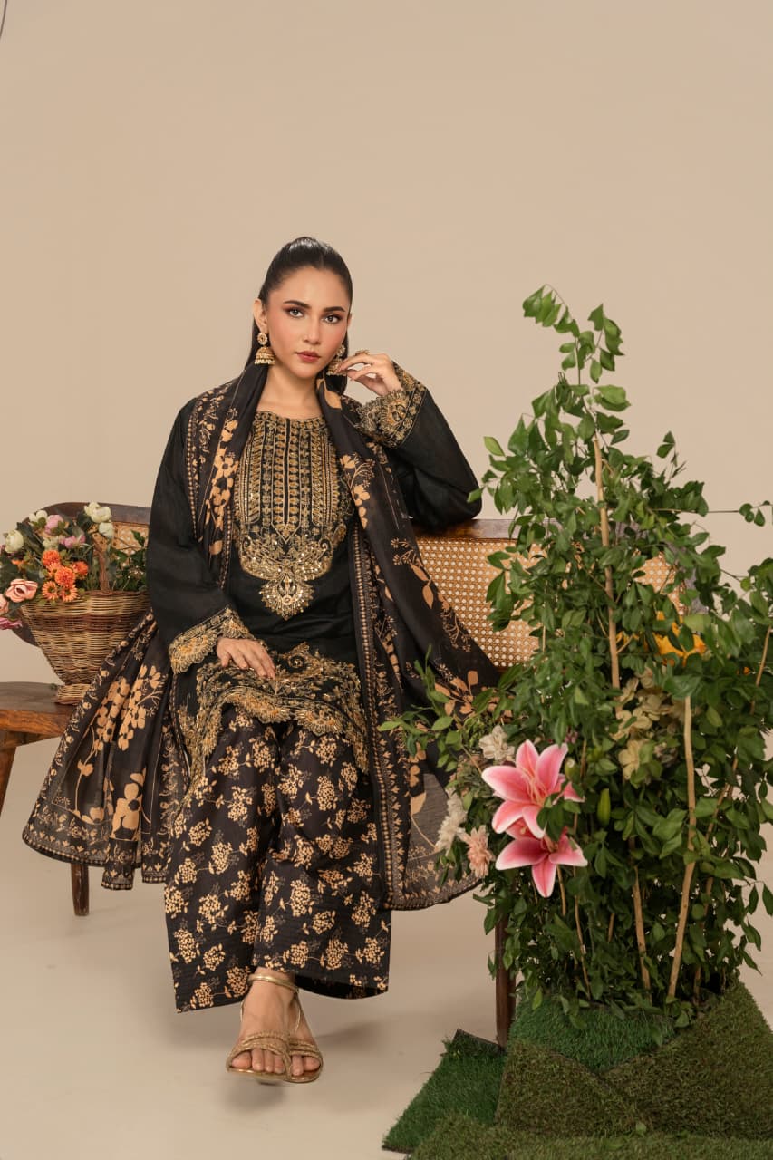 The ensemble is completed with richly printed trousers and a beautifully adorned dupatta, echoing the golden florals that dance across the fabric like starlight in the midnight sky.