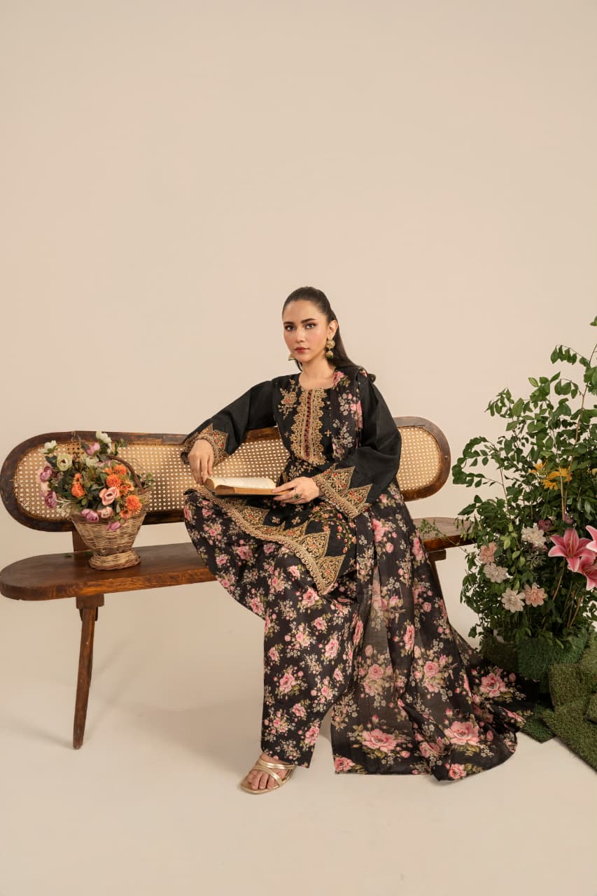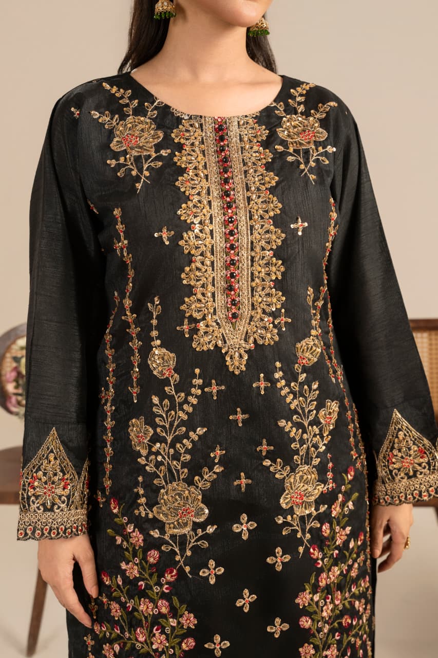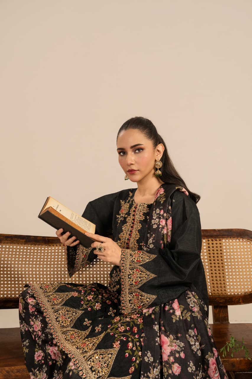 Unveil the essence of timeless sophistication with “Midnight Garden”, an exquisite creation crafted from premium Raw silk, designed especially for the winter season. The deep black canvas serves as the perfect backdrop for rich Golden and antique gold embroidery, reflecting warmth, heritage, and quiet opulence.