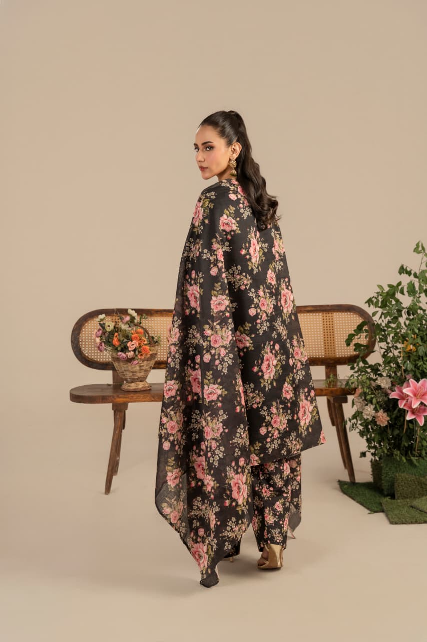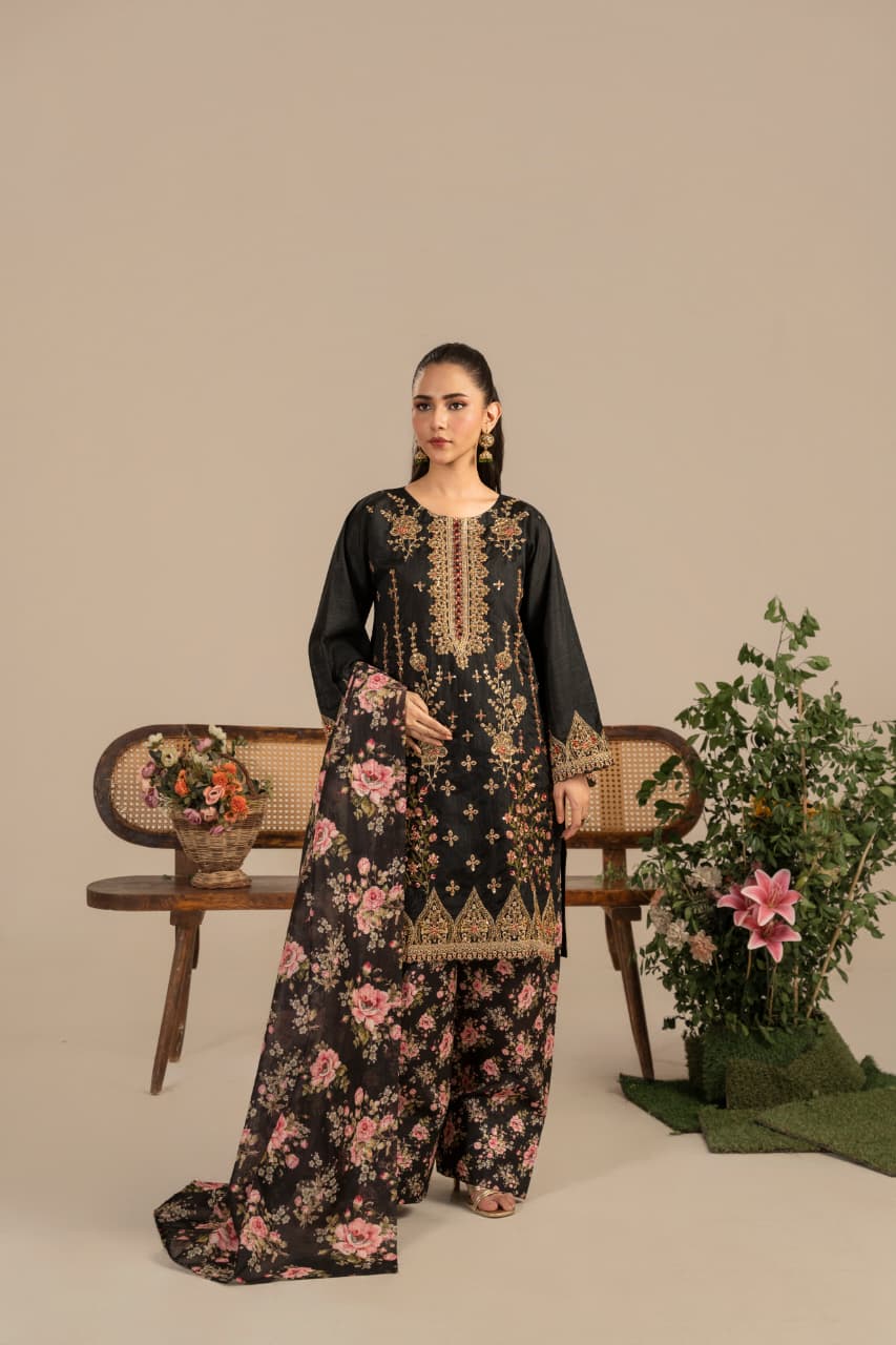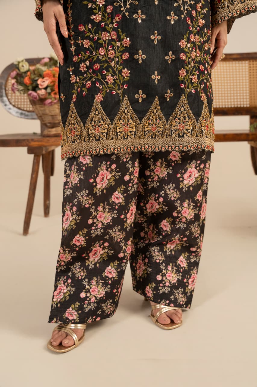 Unveil the essence of timeless sophistication with “Midnight Garden”, an exquisite creation crafted from premium Raw silk, designed especially for the winter season. The deep black canvas serves as the perfect backdrop for rich Golden and antique gold embroidery, reflecting warmth, heritage, and quiet opulence.