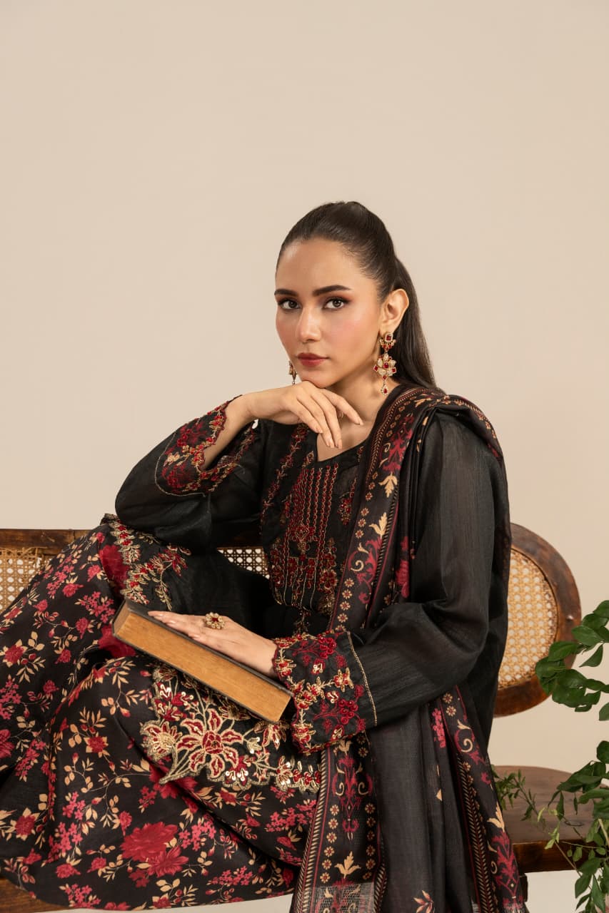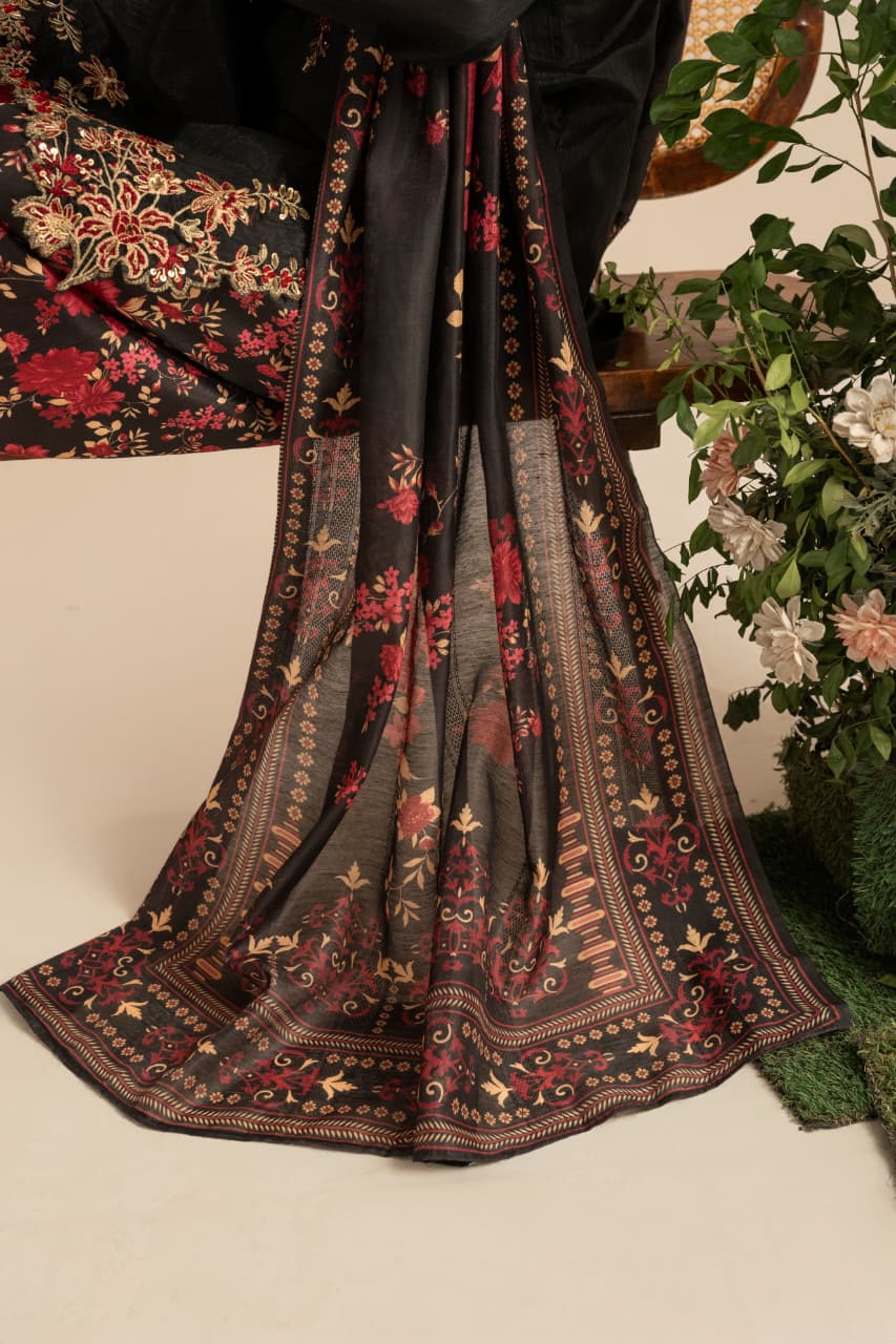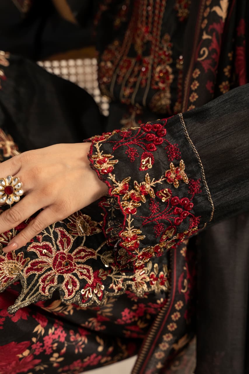 Unveil the essence of timeless sophistication with Zaroon, an exquisite creation crafted from premium Raw Silk, designed especially for the winter season. The deep black canvas serves as the perfect backdrop for rich maroon and antique gold embroidery, reflecting warmth, heritage, and quiet opulence.