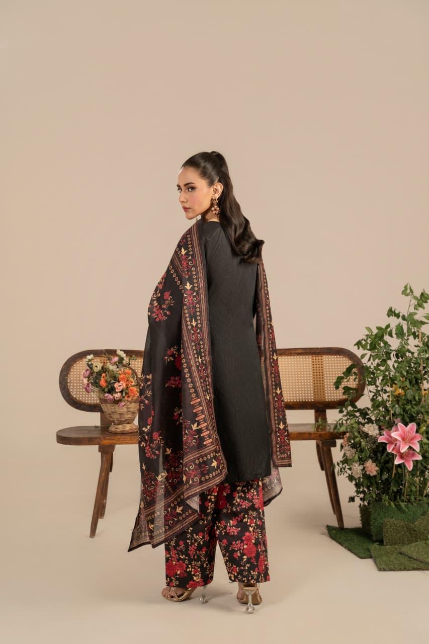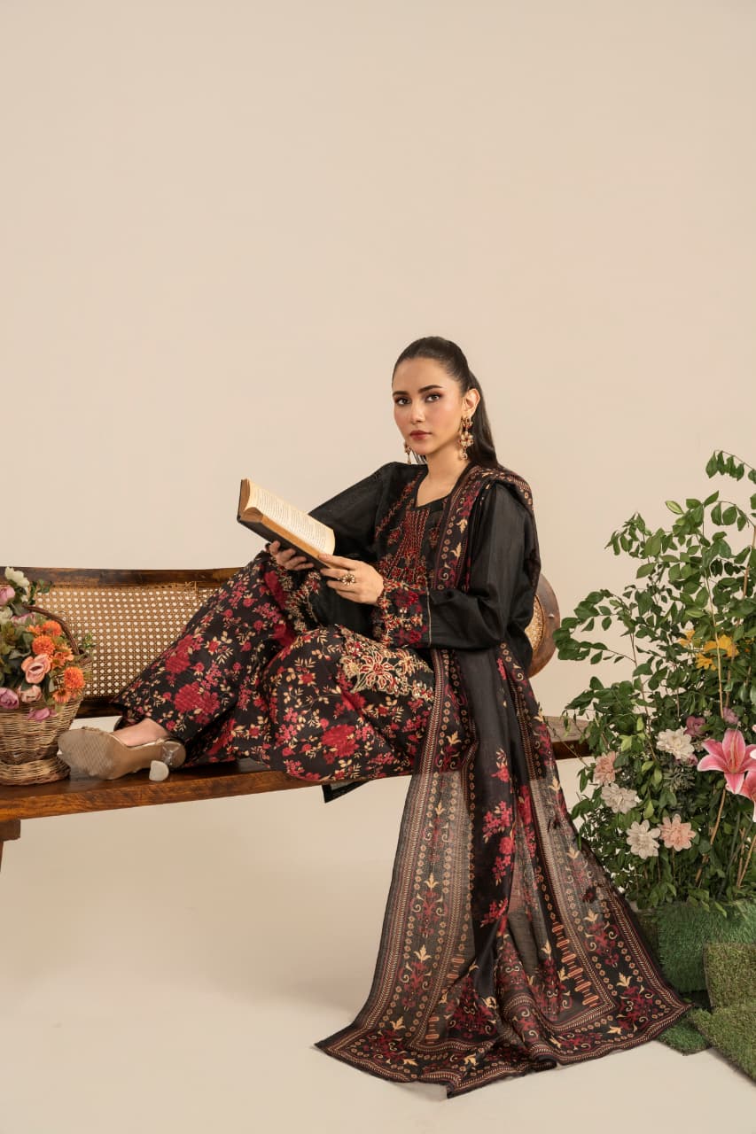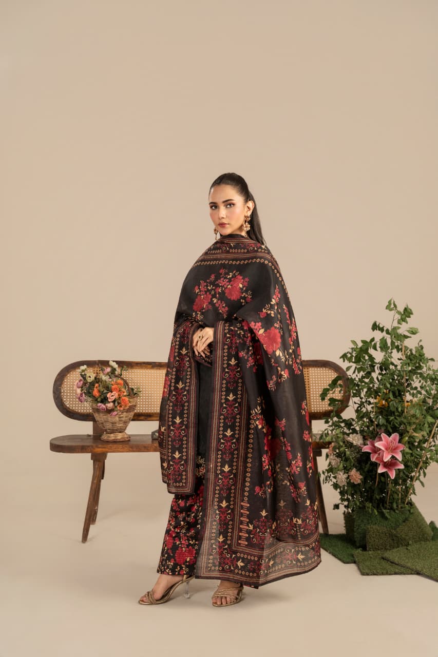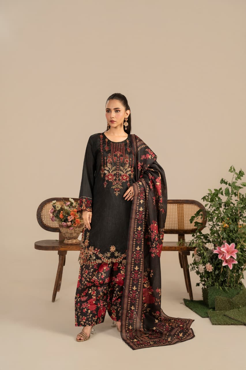 Unveil the essence of timeless sophistication with Zaroon, an exquisite creation crafted from premium Raw Silk, designed especially for the winter season. The deep black canvas serves as the perfect backdrop for rich maroon and antique gold embroidery, reflecting warmth, heritage, and quiet opulence.